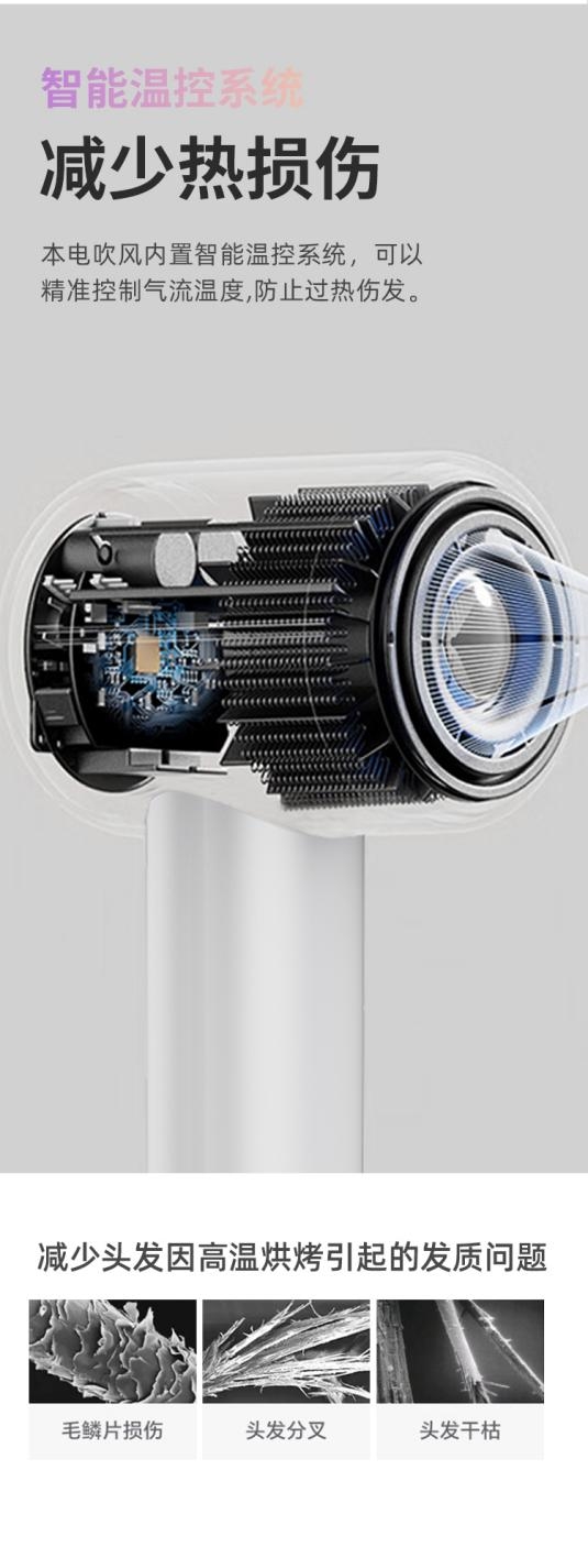 同時,高速吹風(fēng)機通過電子芯片的智能控制,可以實現(xiàn)精細的風(fēng)速調(diào)節(jié),每分鐘能輸出 19m/s 以上的大風(fēng)量,快速將頭發(fā)吹干,縮短使用時間,1分鐘即可吹干利落短發(fā),長發(fā)也僅需5分鐘,高效速干。