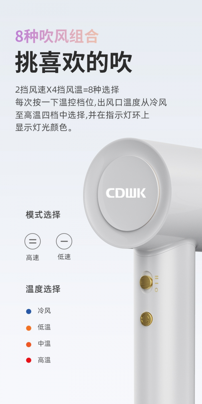 CDWK創(chuàng)點近期推出的新生代高速吹風(fēng)機,配備強勁的風(fēng)力,高效將水分從頭發(fā)中吹干,使人們從此告別繁瑣低效的吹頭發(fā)環(huán)節(jié)。